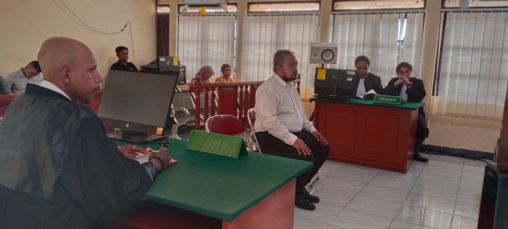 SORONG, mediabetewnews.com Sidang lanjutan perkara dugaan pencurian Sepatu Safety Milik PT Pertamina EP Zona 14 Field Papua dengan agenda pengajuan eksepsi oleh Penasehat hukum (PH) terdakwa Miki Adelson atas dakwaan Jaksa Penuntut Umum (JPU) Kejaksaan Negeri (Kejari) Sorong di gelar di ruang sidang Tirta Pengadilan Negeri Sorong, Selasa (8/7/2025).