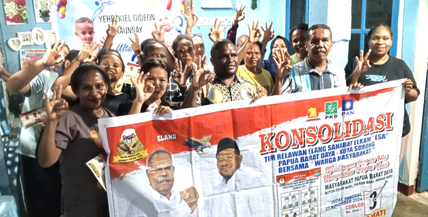 Komunitas ibu-ibu belakang Lapas Sorong yang dipimpin oleh Ibu Renny Antoh saat berkonsolidasi dengan Tim Relawan Elang Sahabat ELKAM Provinsi Papua Barat, Selasa (12/11/2024) semalam menyatakan bahwa kami ibu-ibu yang ada di belakang Lapas Sorong telah bersepakat dan satu hati untuk memberikan dukungan kepada Pasangan Cagub dan Wacagub Nomor Urut 3, Elisa Kambu dan Ahmad Nausrau karena kami sudah tahu rekam jejak dan kerja-kerja dari seluruh pasangan cagub dan wacagub yang maju pada Pilkada Papua Barat Daya yang nota bene mereka adalah pimpinan dari beberapa kabupaten yang ada di Papua Barat Daya.