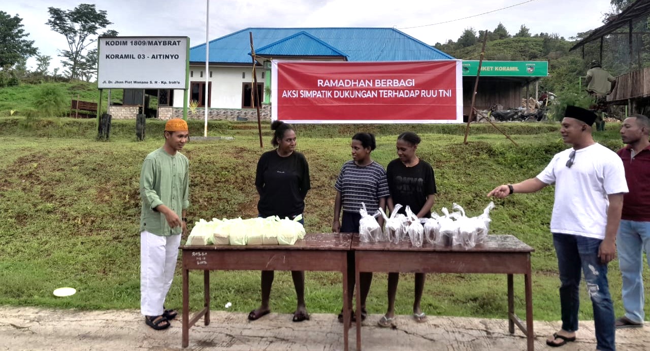 Maybrat, mediabetewnews.com – Koramil 03/Aitinyo Dalam rangka simpatik dukungan terhadap Undang-undang TNI, Kodim 1809/Maybrat bersama Koramil 03/Aitinyo menggelar aksi sosial berbagi takjil kepada masyarakat, kegiatan yang di laksanakan di jalan raya Aitinyo sebagai bentuk rasa syukur dan dukungan terhadap pengesahan UU yang semakin menguatkan peran TNI dalam menjaga kedaulatan bangsa. Aitinyo, Kab. Maybrat, Papua Barat Daya. Selasa,(25/03/2025).