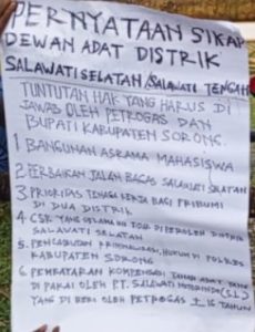 Lebih lanjut Derek menambahkan, dalam pemalangan ini masyarakat adat Moi Maden meminta PT Petrogas, Penjabat Bupati Sorong dan Kapolres Sorong untuk menandatangani surat tuntutan yang berisi 6 poin antara lain :
