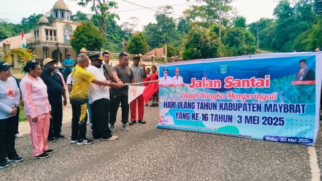 Maybrat, mediabetewnews.com – Papua Barat Daya — Dalam rangka menyambut Hari Ulang Tahun Kabupaten Maybrat yang ke-16, pemda Maybrat bersama TNI/Polri, Bank papua ,siswa/siswi SD, SMP dan SMA menggelar kegiatan jalan santai, senam ritmik, dan aksi bersih lingkungan di Kumurkek, Distrik Aifat, pada Rabu pagi, 30 April 2025.