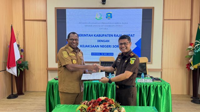 Waisai, mediaetewnews.com – Pemerintah Kabupaten Raja Ampat bersana Kejaksaan Negeri Sorong melakukan penandatanganan kesepakatan bersama atau Memorandum of Understanding (MoU, Senin, 19 Mei 2025