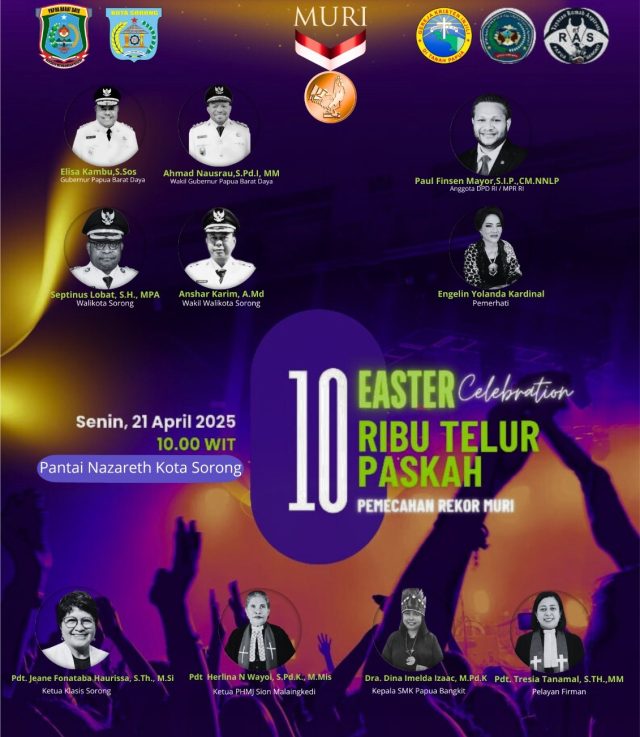 “Saya mengajak dan mendorong semua elemen-elemen masyarakat terutama umat Nasrani yang mendiami Kota Sorong dan Provinsi Papua Barat Daya untuk sama-sama mencetak rekor Museum Rekor Indonesia (Muri) dengan menyediakan 10.000 telur Paskah dalam perayaan Paskah dan akan dilaksanakan di Pantai Nazareth (sebelum Pantai Tanjung Kasuari) pada 21 April 2025, Senin pagi di Pantai Nazareth, Kelurahan Tanjung Kasuari, Distrik Maladumes, Kota Sorong.